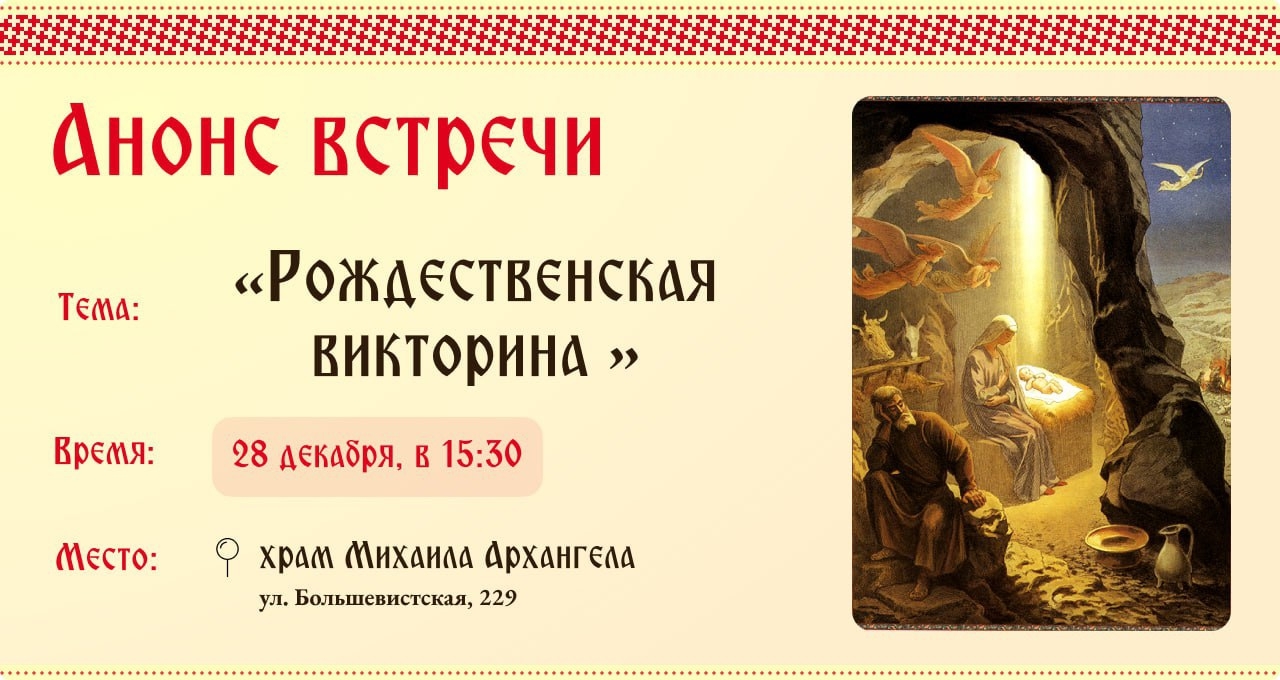 Наша встреча будет посвящена проведению "Рождественской викторины", мы разделимся на команды и будем отвечать на вопросы о Рождестве Христовом, библейских событиях и традициях праздника.