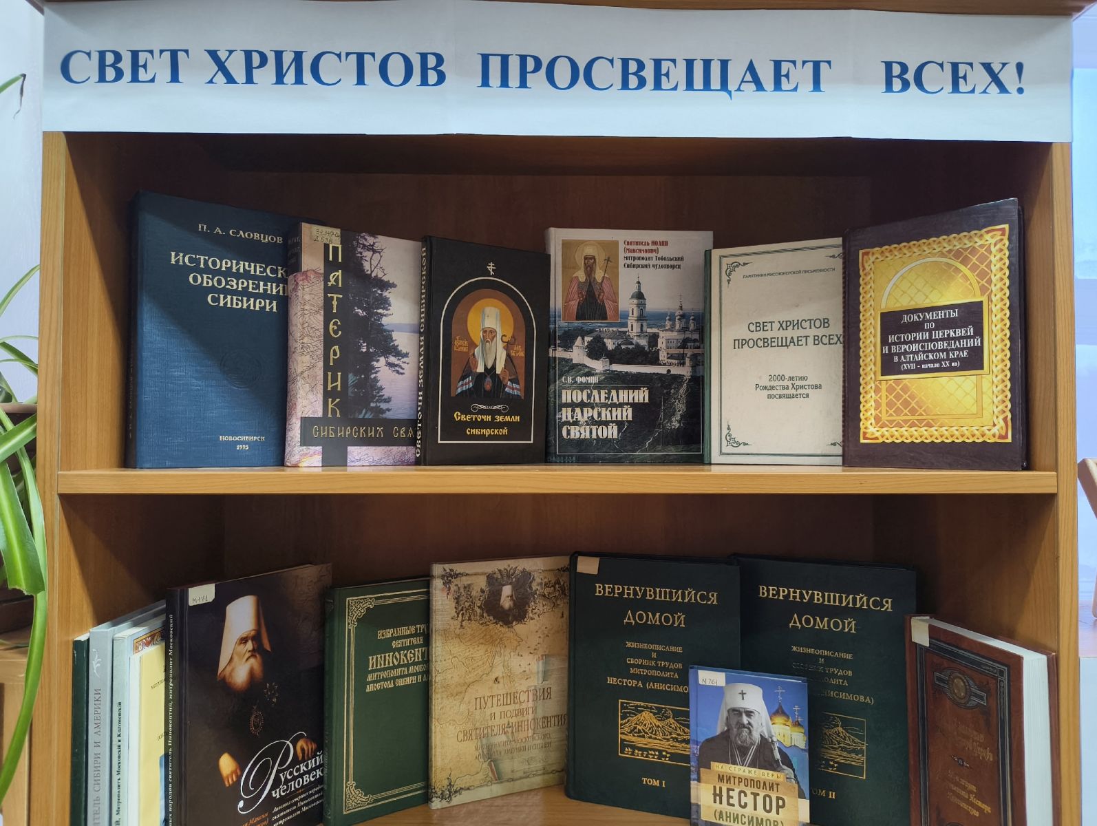 С 1 февраля в библиотеке храма Михаила Архангела проходит книжная выставка "Свет Христов просвещает всех!", посвященная миссионерской деятельности Русской Православной Церкви на Алтае, в Сибири и Дальнем Востоке.