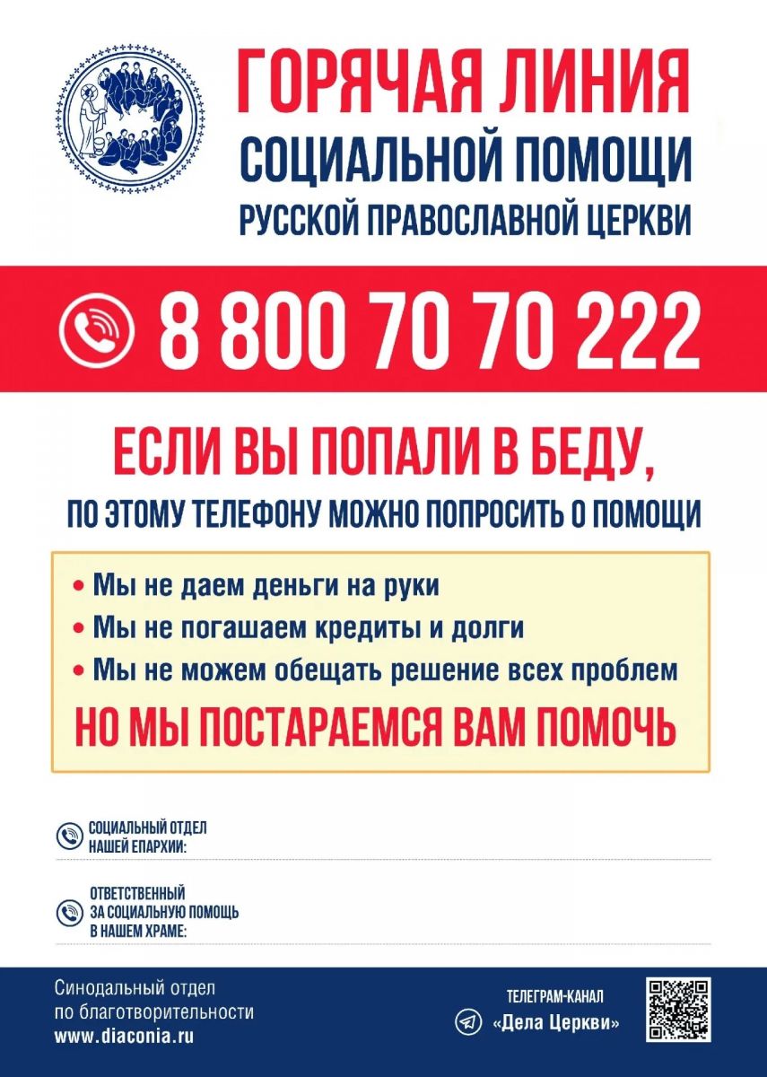 По благословению Святейшего Патриарха Кирилла с февраля 2021 года работает общероссийская горячая линия церковной социальной помощи 8-800-70-70-222.