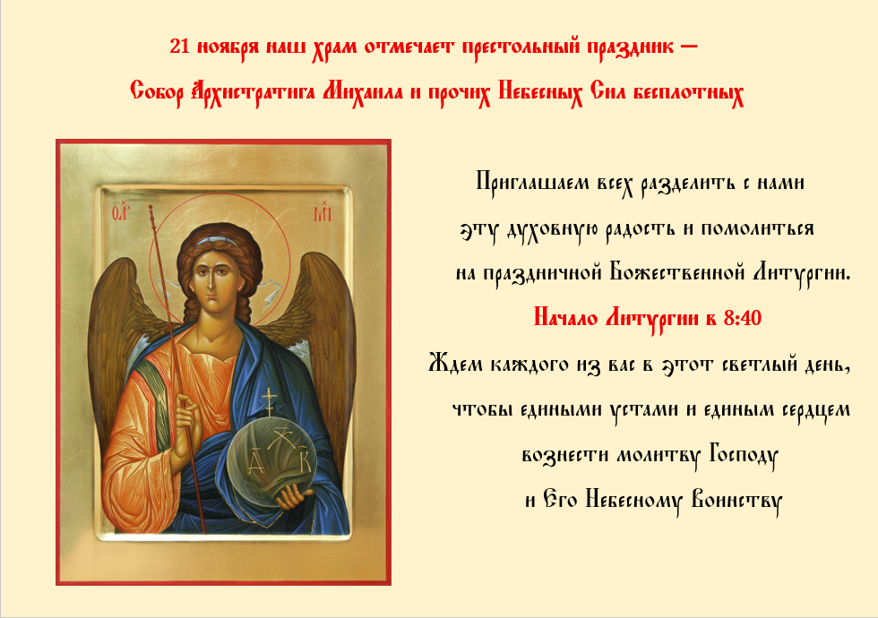 21 ноября наш храм отмечает престольный праздник — Собор Архистратига Михаила и прочих Небесных Сил бесплотных
