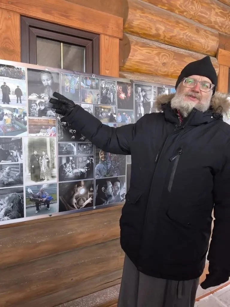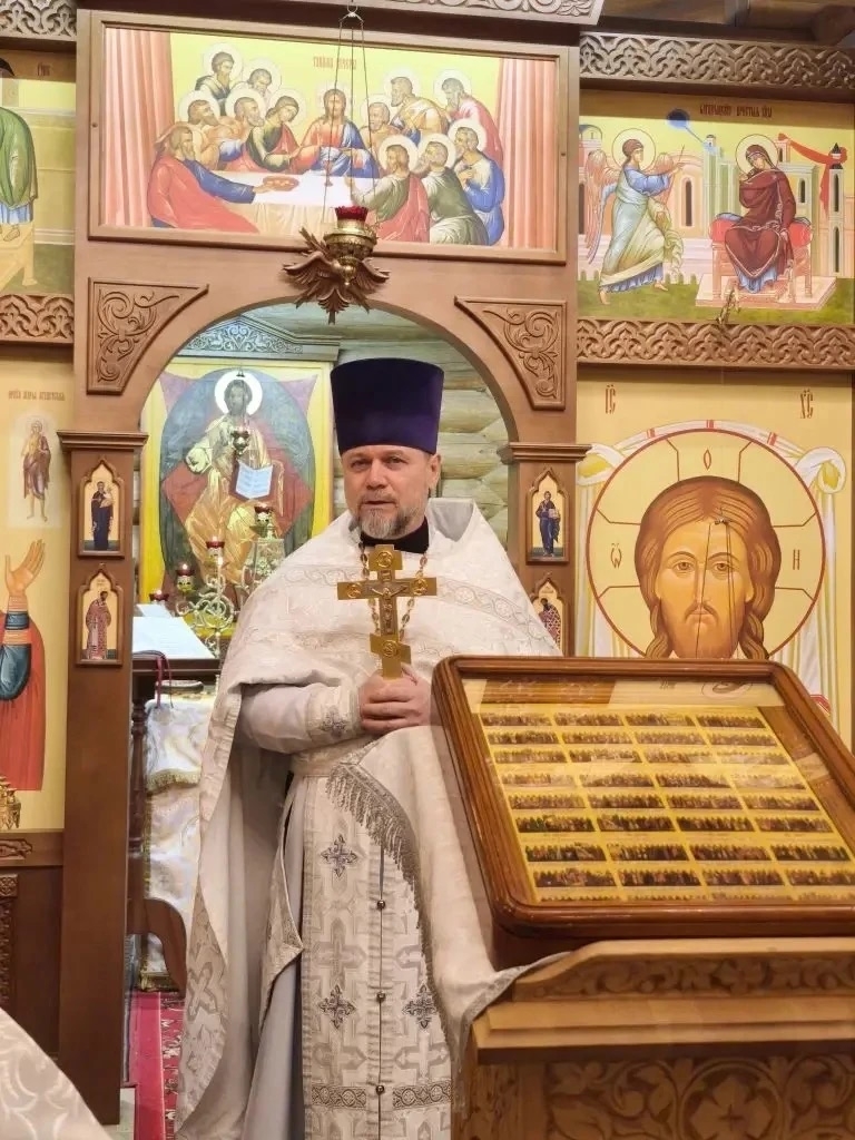 Настоятель прихода отец Дмитрий Полушин провел экскурсию по храму, рассказал о святынях храма. В этом году храму исполнилось 25 лет, на стенде из фотографий можно увидеть как и с чего начиналась жизнь прихода. Изначально Богослужения проводились в небольшом вагончике, затем был построен деревянный храм. Храм воздвигли сами прихожане, не использовав, как в старину, ни единого гвоздя.