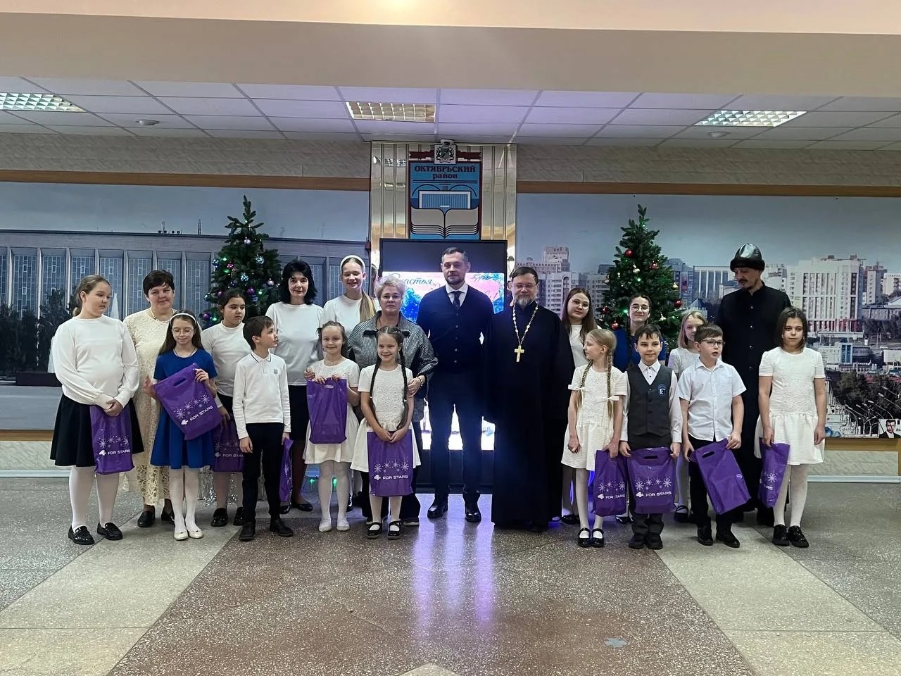20 января 2026 года группа учащихся - артистов воскресной школы с настоятелем храма Михаила Архангела иереем Игорем Морозовым поздравили с праздниками Рождества Христова и Крещения Господня сотрудников Администрации Октябрьского района.