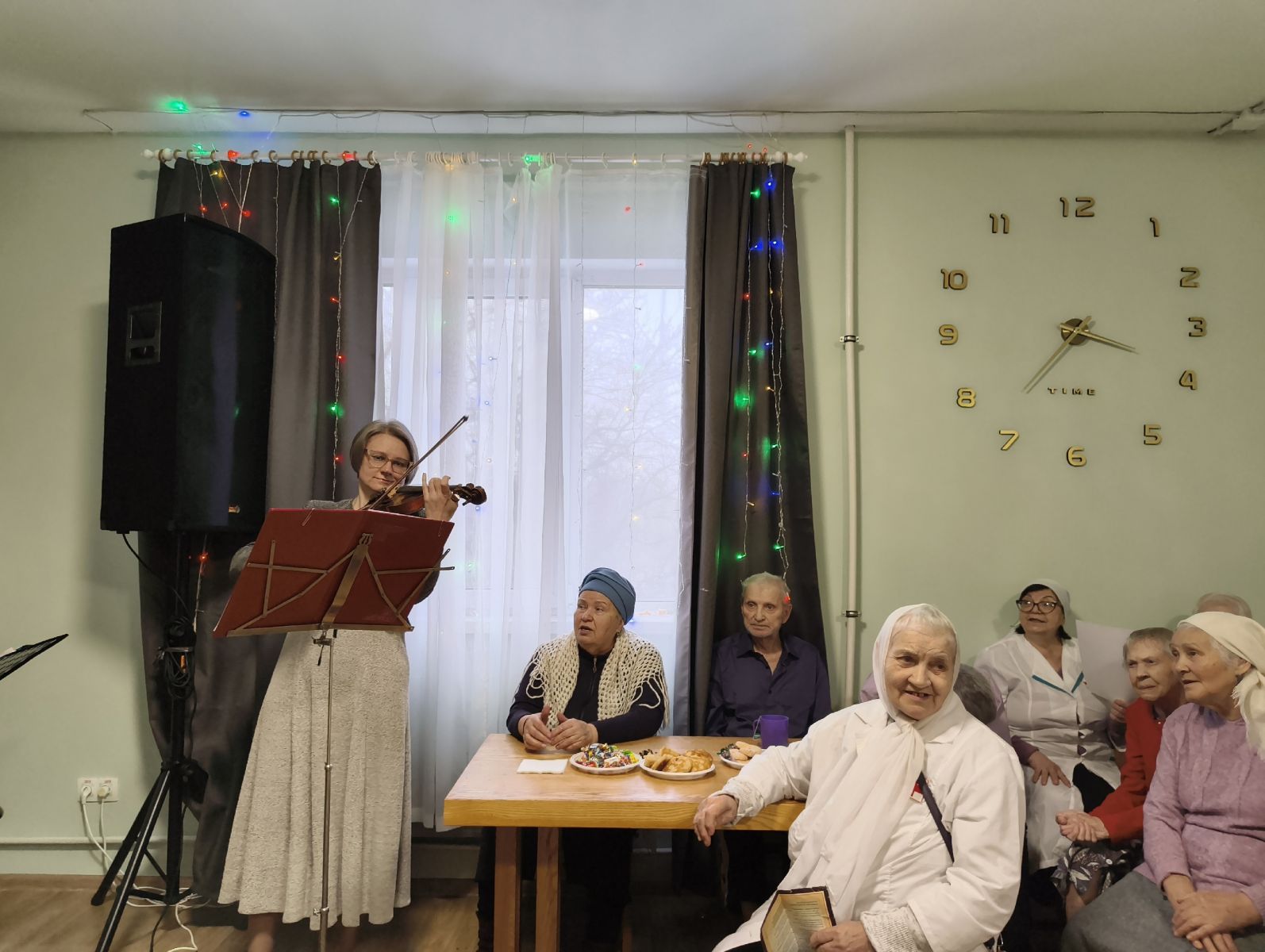 Концертно-поздравительную программу организовали миссионеры храма, пригласили ведущую, певцов и музыкантов, приготовили угощения. С приветственным словом к постояльцам обратился клирик храма Михаила Архангела отец Иоанн Ходаковский, поздравив собравшихся с праздником Сретения и напомнил о важности Великого поста, о его значимости для спасения души.