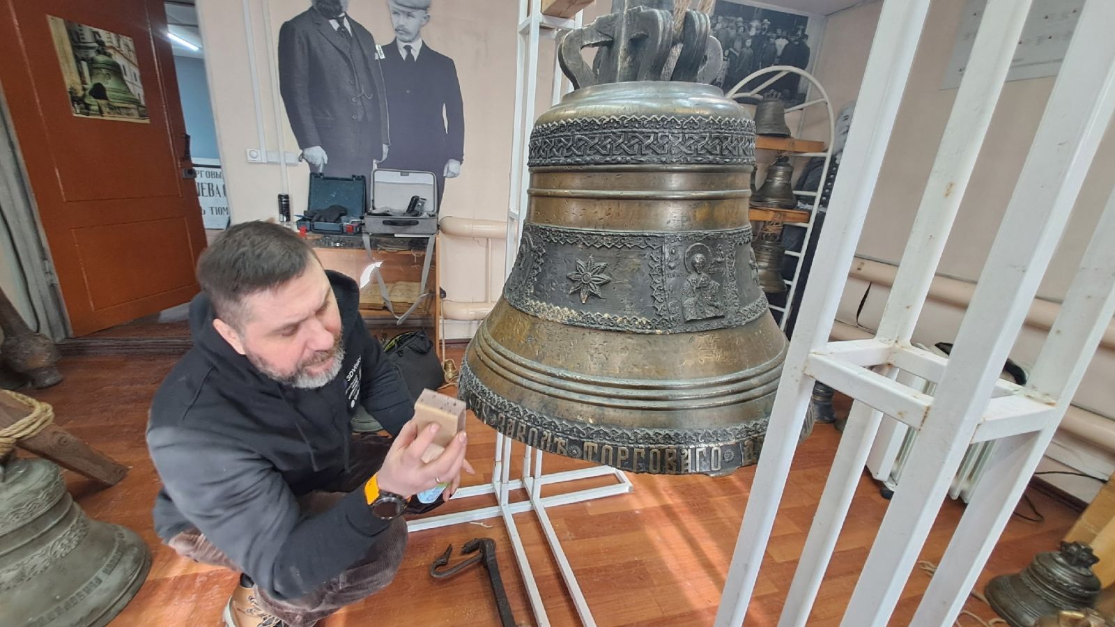 В минувшее воскресенье мы работали над получением 3D копии самого крупного из экспонатов нашего Музея колокольного звона - колокола, отлитого в 1904 году в Тюмени на заводе "Петра Ивановича Гилева сыновей". Колокол весит 10 пудов и 20 фунтов, богато украшен орнаментами, иконными изображениями и надписями. Сканирование такого достаточно большого объекта представляет определенные трудности, и мы с ними столкнулись напрямую.