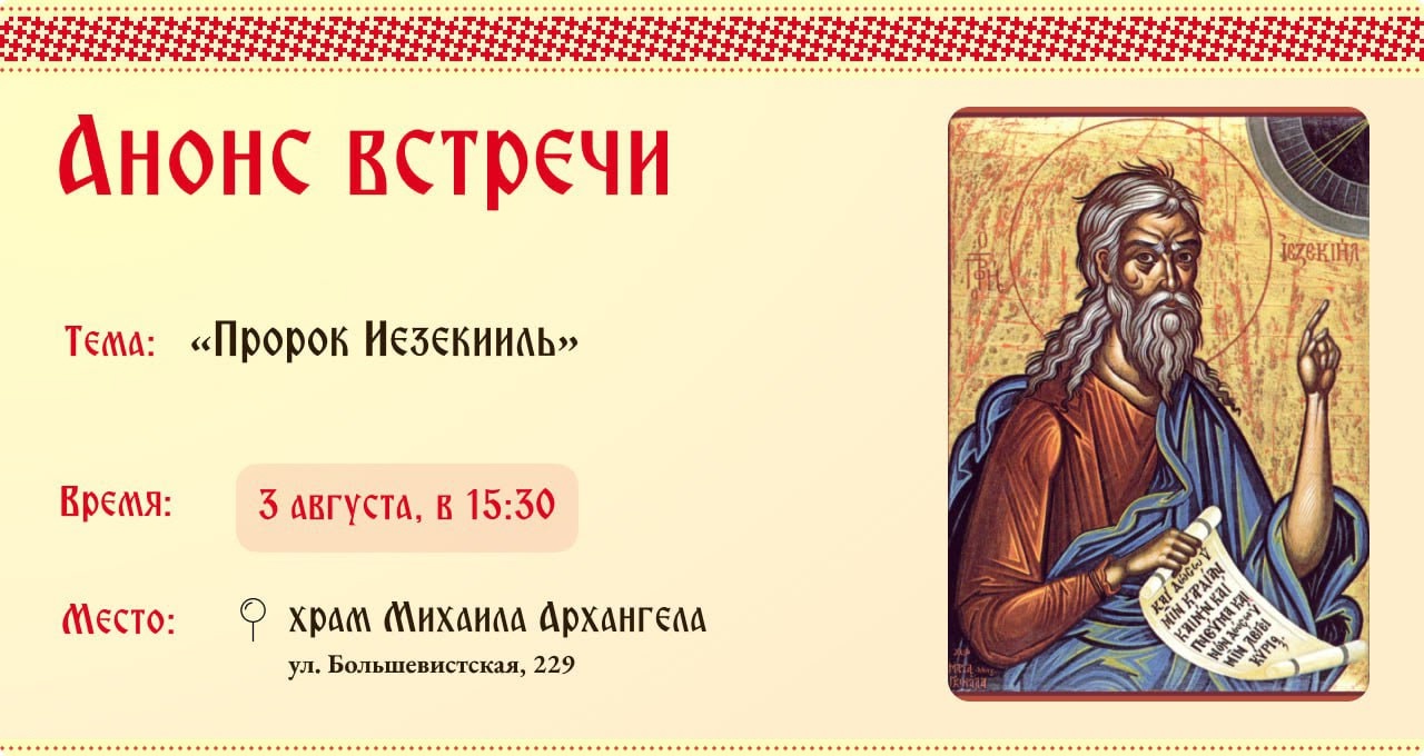 Следующая встреча молодёжного клуба пройдет в воскресенье, 3 августа, в 15:30 и будет посвящена пророку Иезекиилю, чья память будет совершаться в этот день.
