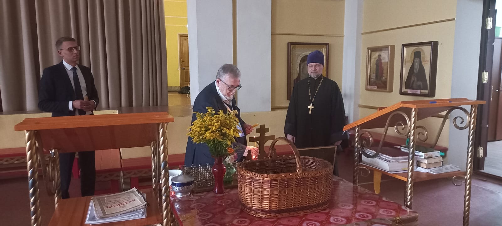 Владимир Юрьевич прибыл в наш город по приглашению для участия спикером в конференции. По благословению Владыки Владимир Юрьевич побывал в духовной семинарии, где отец Игорь Морозов проректор семинарии, благочинный 2-го Градского благочиния, настоятель храма Михаила Архангела, провел экскурсию, показал библиотеку, старинные книги. Отдельное внимание уделили книге 16 века – Псалтири с Часословцем, изданного русским первопечатником Иваном Федоровым в Заблудове в 1570 году. Книга была случайно найдена в библиотеке духовной семинарии. Также отец Игорь рассказал о том, как функционирует семинария, после побывали в кабинетах, где готовится помощь на СВО.